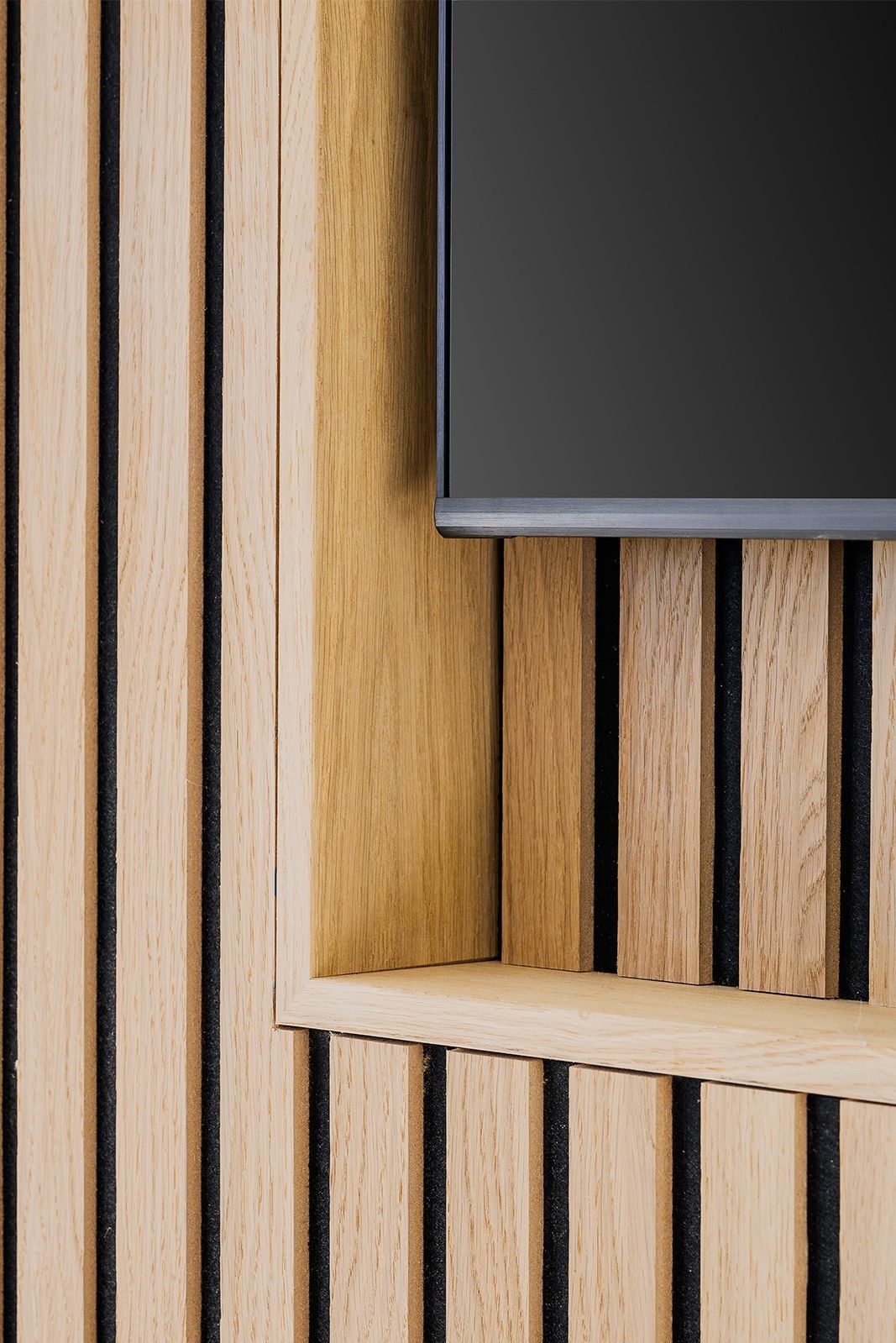 Disponible en Fieltro de Poliester negro y ripado en MDF color madera